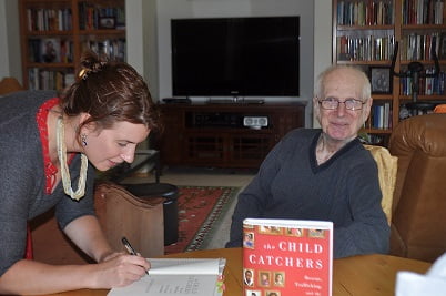 Kathryn Joyce’s visit extended to the Vance Twins’ adoptive father, Allen Vance. Despite surviving a 100-foot fall that left him physically disabled in 1984, Allen’s resilience and unwavering positivity were apparent when he greeted Kathryn with his wide grin and trademark response, “I’m Excellent.” His story of overcoming adversity resonated deeply with Kathryn, who went back to school in order to learn to edit so he could help his daughter edit Adptionland: From Orphans to Activists. Before his injury, he was an aerospace engineer and wrote his memoir at 88 years old with the help of his daughter, Janine, who coached and guided him through the process.